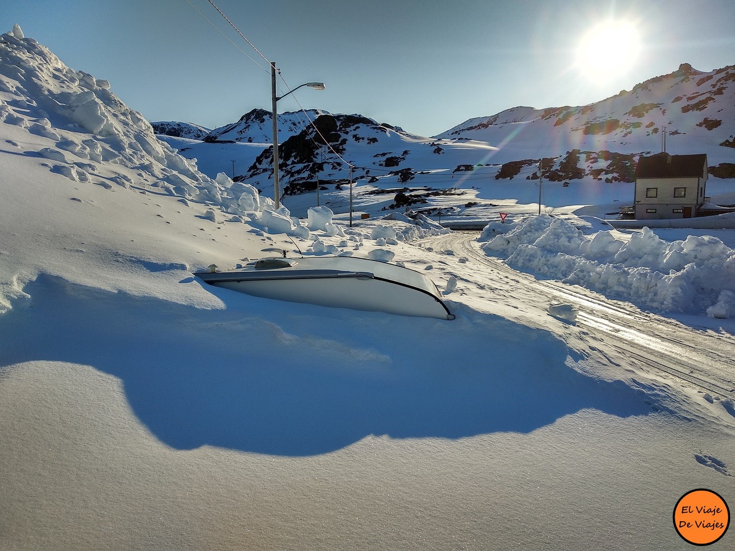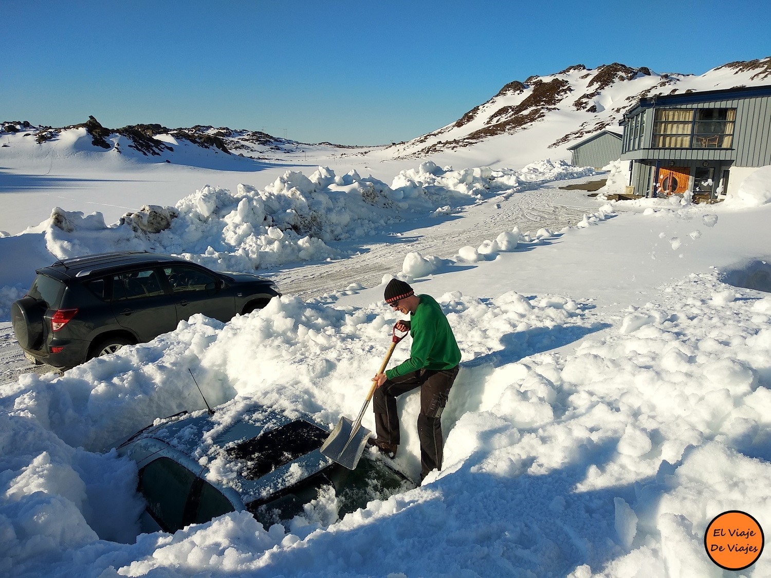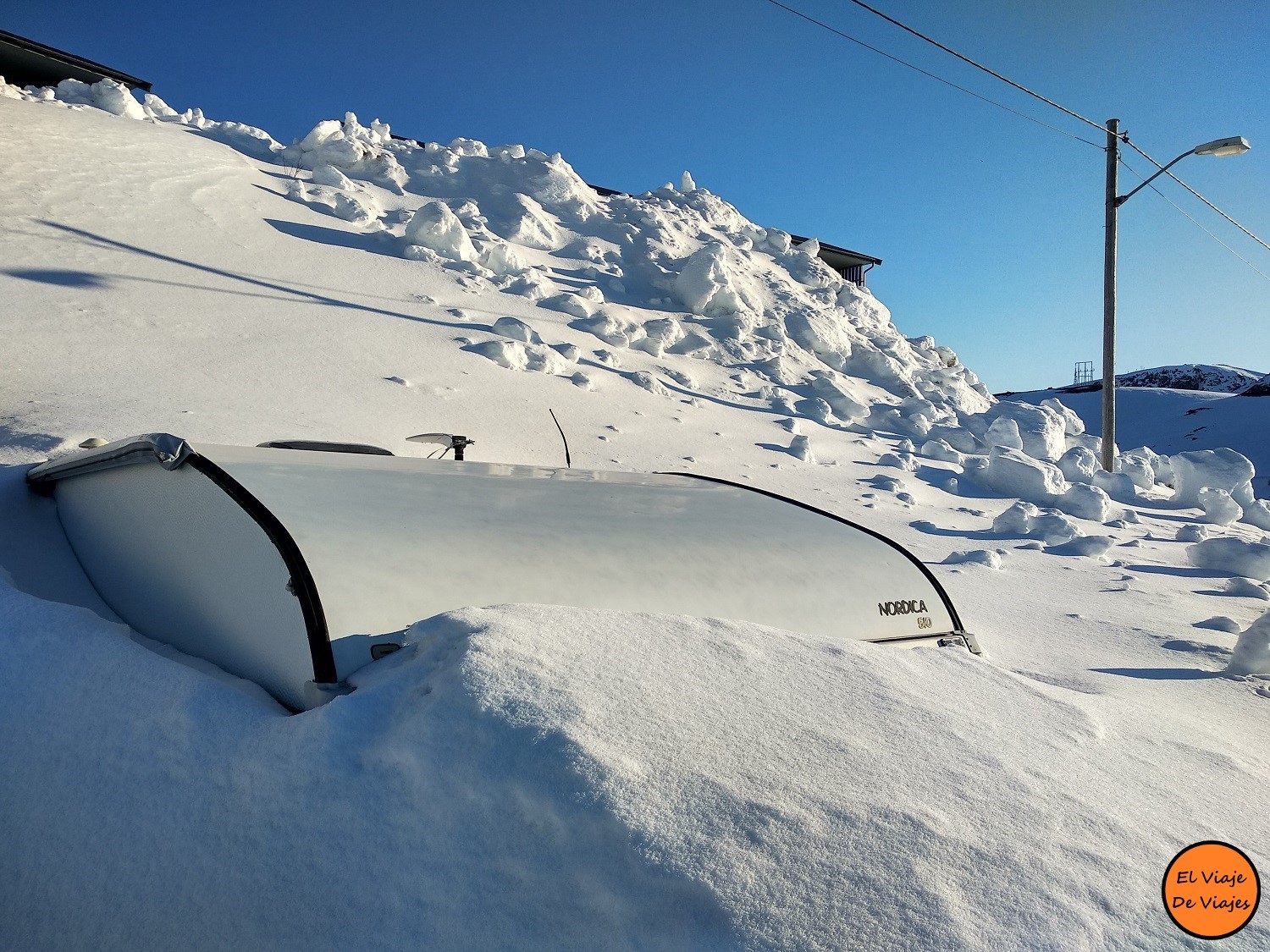 Al lado del automóvil de mi hermano también había una caravana, casi toda cubierta por la nieve.